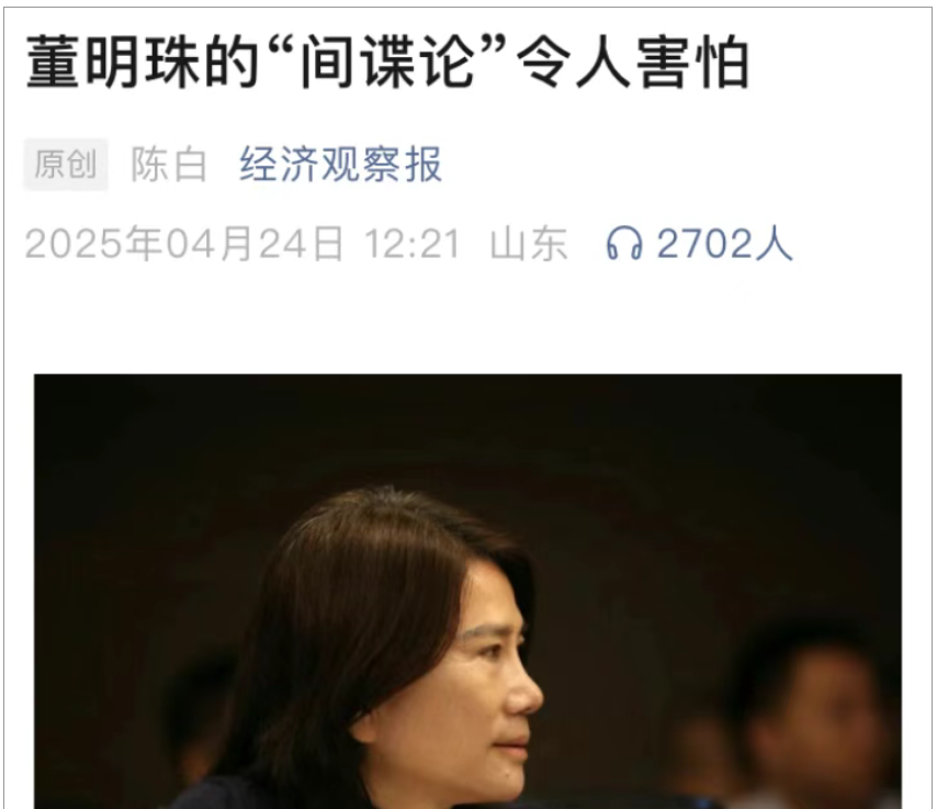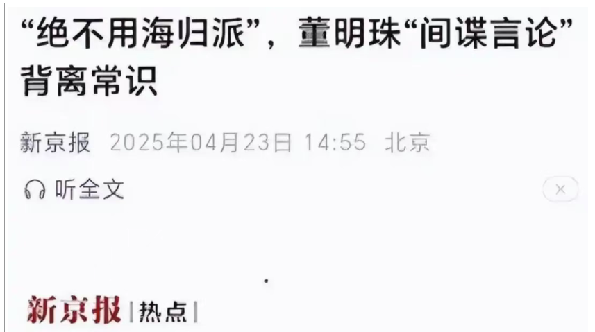 4月22日,珠海格力电器召开2025年第一次临时股东大会,71岁的董明珠以全票连任董事长,并且她公开宣称:“我们在人才培养中,绝不用一个海归派,因为海归派里面有间谍。我不知道谁是、谁不是,只能保守地选择国内高校培养的人才。”