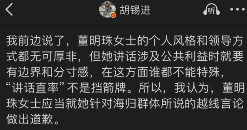 4月24日,知名媒体人胡锡进也通过其百万粉丝账号发文,强烈批评董明珠的言论“明显越线”:他认为董明珠作为格力品牌代言人和公众人物,其“绝不用海归派”的说法构成身份歧视。