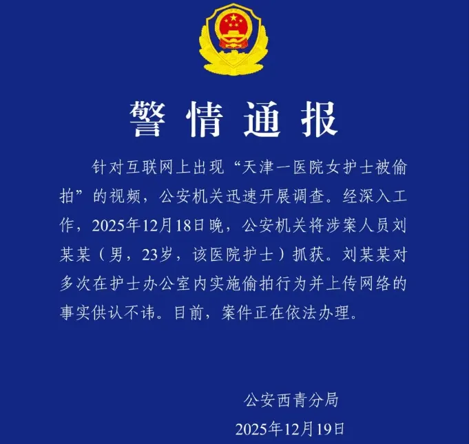 随后天津市公安局西青区分局发布警情通报称,警方经过深入调查后于 12月18 日晚抓获了涉案嫌疑人刘某某(男,23 岁,该医院护士),刘某某对多次在护士办公室内实施偷拍行为并上传网络的事实供认不讳,。