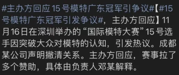 11 月 16 日,一场在广东举办的模特大赛落下帷幕,本来地方性赛事不算多大新闻,但冠军一出场,当天微博热搜直接飙升,原因很简单——冠军的形象与大众心中“模特冠军”的画风完全不同。