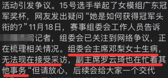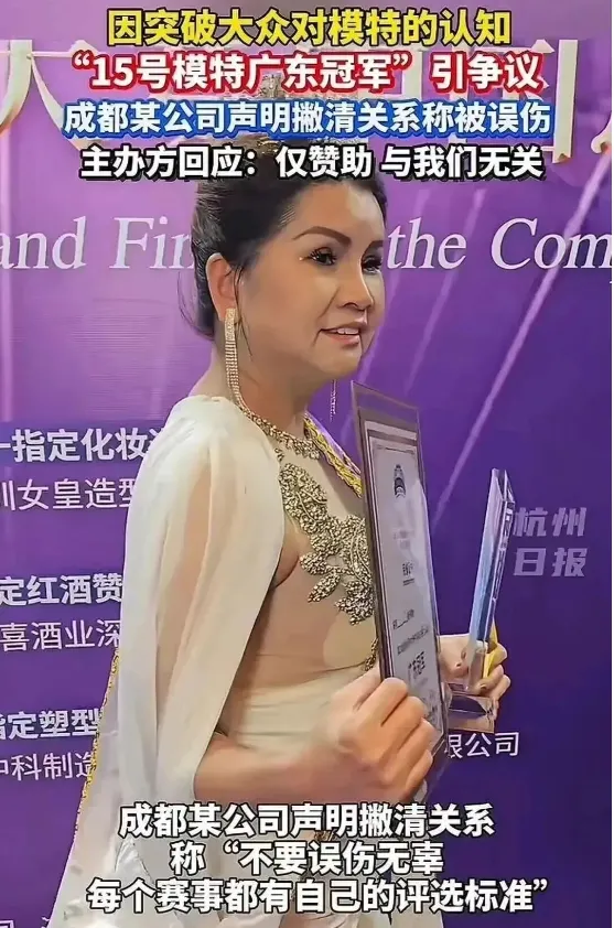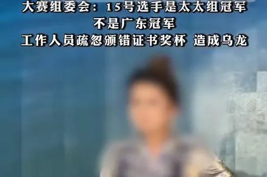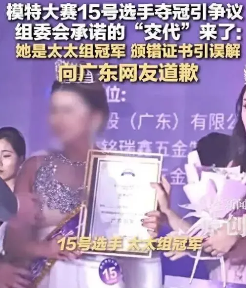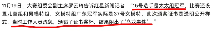 就在大家以为闹剧到此结束时,11 月 19 日主办方给出了一个堪称年度最强反转的“解释”:“工作人员疏忽,颁错了证书奖杯。15 号选手实际上是‘太太组’冠军,真正的广东女模冠军是 37 号。”