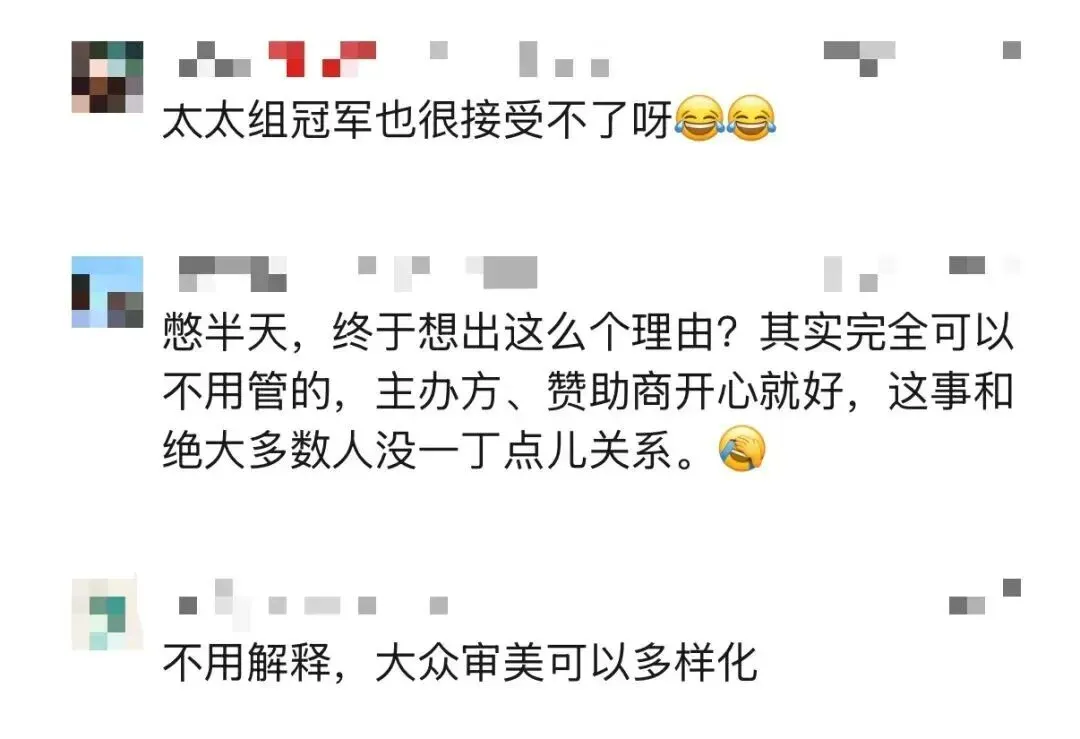 所以从根本上来说,本次事件不是网友排斥“非传统审美”,而是整个赛事组织缺乏公信力,导致大众把审美争议延伸到对整个比赛的质疑,如果这事换一种呈现方式,可能早就平息了;但偏偏主办方用一套套神级回应把事件越推越高。