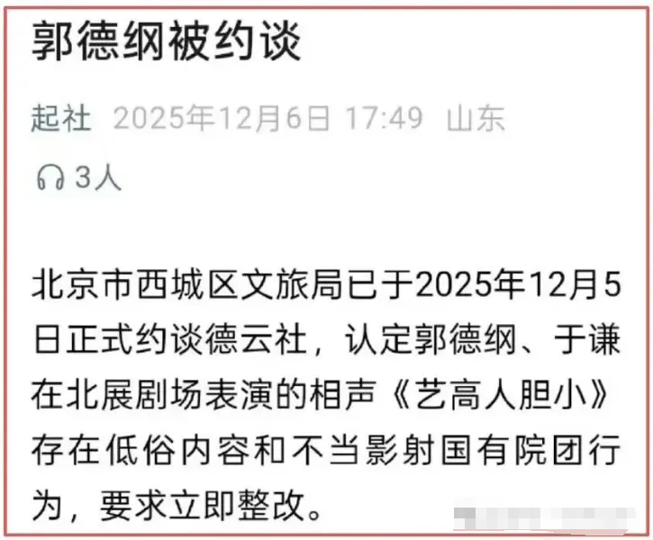 12 月初,一则关于相声演员郭德纲和搭档于谦在演出中“被投诉低俗”的消息在网络上引发热议,有报道称北京市西城区文化和旅游局已于 12 月 5 日约谈德云社,认为他们在北展剧场演出的一段相声《艺高人胆小》 中存在低俗内容、并对国有院团有不当影射,要求整改。