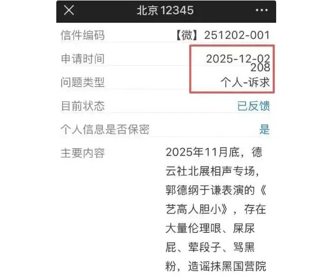 随后,大量网友转发所谓的投诉截图,包括一张显示网友在“12345”投诉平台提交的举报内容称该段表演涉及“伦理哏、荤段子、骂黑粉、造谣抹黑国营院团”等措辞,似乎证实投诉确有发生。
