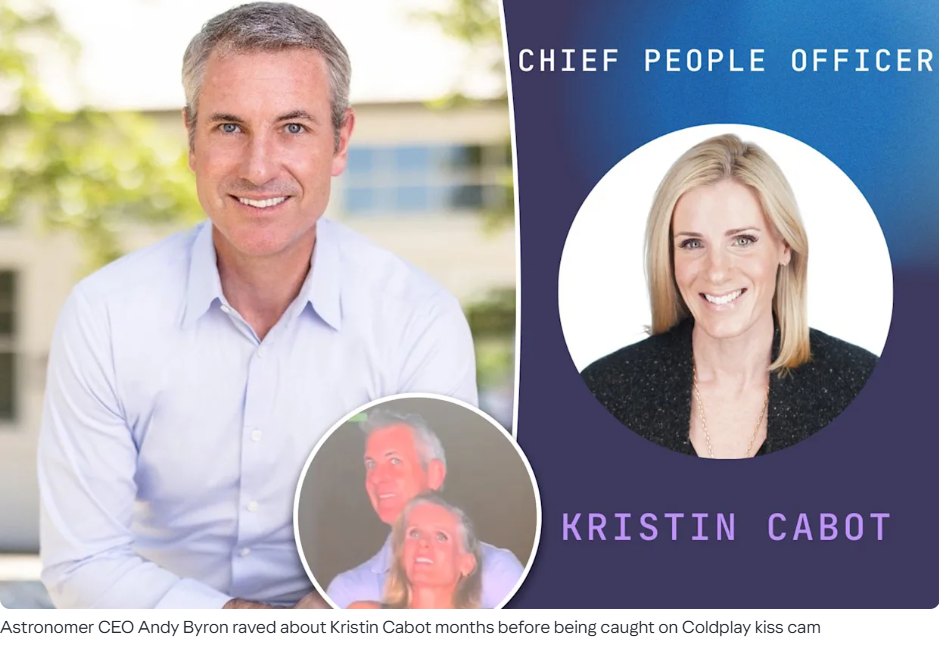 现场观众有人窃笑,还有人掏出手机开始录像随后通过社交媒体的传播,然后这对男女的身份被迅速扒出:男方是一家市值超过10亿美元的高科技公司Astronomer的首席执行官(CEO)Andy Byron,女方则是该公司的HR总监Kristin Cabot。