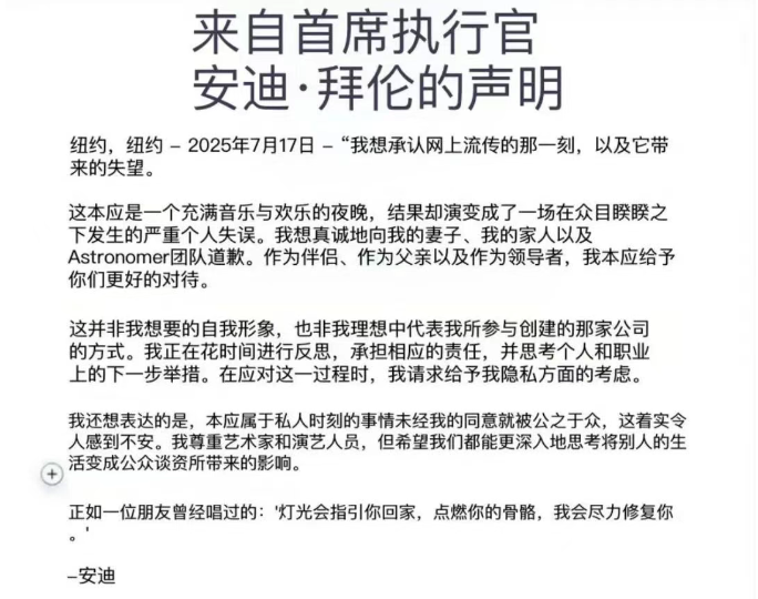 事发一天之后,Andy Byron发表声明向妻子和家庭以及公司团队道歉,但是在声明的结尾他指责演唱会的摄像头侵犯了他的隐私。