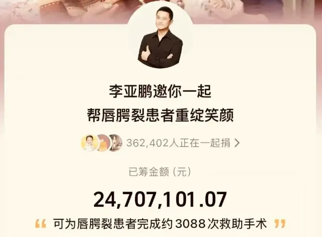 值得一提的是,这些捐赠行为并非全部是李亚鹏发布此次危机后发生的,新近曝光的名单中有不少长期支持嫣然医院的明星,他们在过去十多年间曾通过不同方式参与资助项目,包括早年的慈善晚宴筹款、病房捐赠等。
