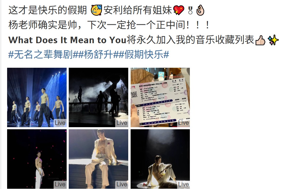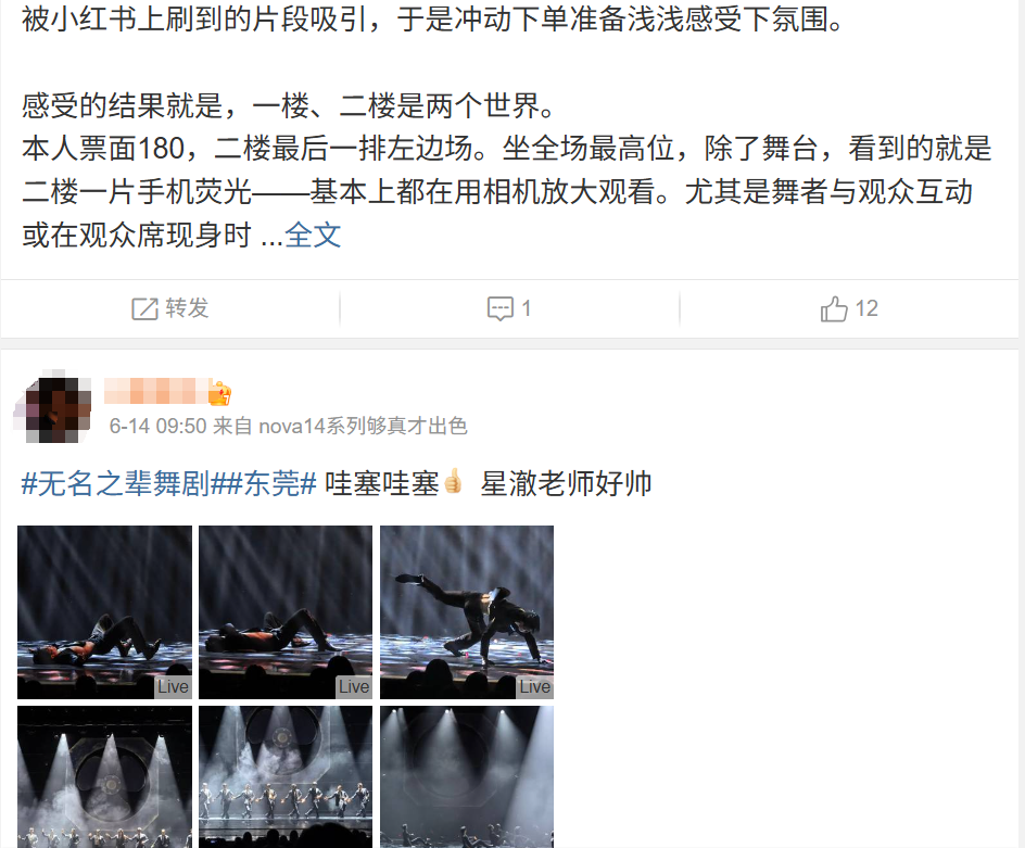 不少观众在观演后分享的视频和图片中,刻意截取了男舞者赤裸上身、穿着紧身服装、或进行具有性暗示意味肢体动作的片段,这些片段被配以诸如“这哪里是舞剧,这是男模大秀”、“八块腹肌的诱惑”、“来看肉体盛宴”等标题,在小红书、抖音等平台疯传。