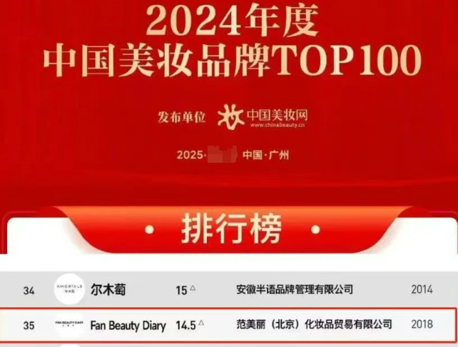最近中国美妆网发布的“2024年度中国美妆品牌TOP100”榜单引起了广泛关注,因为这份榜单中显示范冰冰创立的美妆品牌Fan Beauty Diary(以下简称FBD)以14.5亿元的营收位列第35名,成为行业内的一匹黑马。