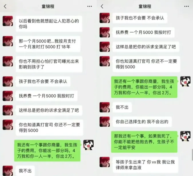 在初期的沟通中,双方的表现更像是在进行一场冰冷的商务谈判:童锦程方面最初开出的价码是每月3000元,后提升至每月5000元,并承诺支付18年 ,但这种“按月发工资”式的抚养方案显然无法平息女方的怒火;在女方看来这不仅是经济上的吝啬,更是对他曾经承诺的背叛和对孩子未来的极度漠视 。