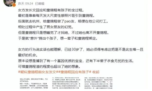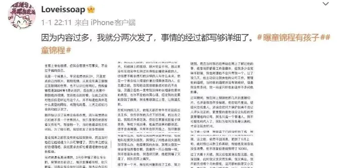 在那场直播中,女方不仅展示了大量的聊天记录,更坦承了两人交往初期的一些隐秘细节:为了表达“忠心”她曾向童锦程发送过大量大尺度的私密照片,而这些照片也成了两人关系突破界限的催化剂 ,当这些最隐私、最不堪的内容被公之于众,童锦程经营多年的“深情人设”瞬间支离破碎。