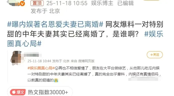 11月18日,微博话题#曝内娱著名恩爱夫妻已离婚 迅速点燃了网络热度,成为当日最轰动的“瓜”。
