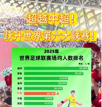 再说几个“厉害”的数据:苏超联赛联赛平均上座人数达到20,160人,超越中超,并在全球足球联赛中排名第六,仅次于德甲、英超、西甲、意甲和墨超;抢票中签率不到3%,比2022年卡塔尔世界杯的5%还要抢手;近期苏超在直播平台上的数据比国际足联10亿美金打造世俱杯以及温网都要好...... 这意味着苏超不仅在国内业余足球圈站稳了脚跟,甚至在全球范围内都展现出了非凡的吸引力。