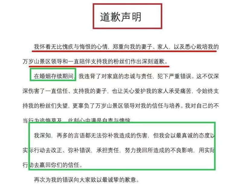 7月8日,李某剑公开发布道歉声明承认自己在婚姻存续期间犯下严重错误,表示对妻子、家人、景区领导和粉丝深感愧疚,并称自己“追悔莫及”。