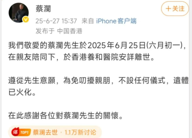 蔡澜先生其生命的最后一程也终结于香港,据家人通过社交媒体透露他走得很平静,身边有亲友陪伴并遵照他的遗愿没有举行任何悼念仪式,这一低调的告别与他一贯洒脱的性格相呼应。